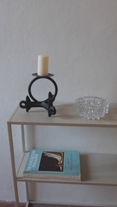Forged from heavyweight wrought iron during the '60s/'70s, this brutalist candle holder is elegantly shaped. A primitive design that would look beautiful decorating a console, side table or mantel. Solidly handcrafted for years of enjoyment, it's suitable for any candle. A great find for anyone who's a fan of mid-century modern design or wabi-sabi interior. The candlestick has no inscription or signature.